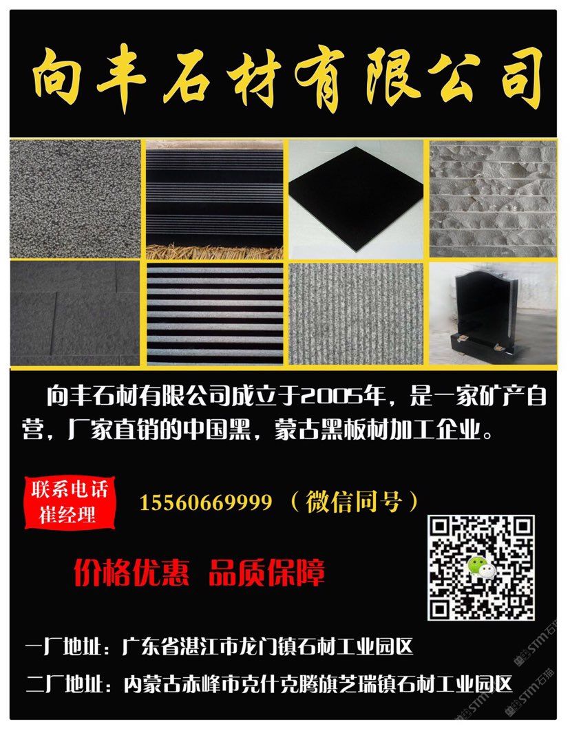 向豐石材有限公司成立于2005年,是一家礦山自營(yíng)的蒙古黑板材加工企業(yè)!主營(yíng)項(xiàng)目:各種薄厚工程板、光面、火燒面、機(jī)刨面、荔枝面、斧鑿面、墓碑等。向豐石材以“客戶至上信譽(yù)”的經(jīng)營(yíng)理念,先進(jìn)的技術(shù)和現(xiàn)代化管理為基石,不斷的開拓創(chuàng)新與時(shí)俱進(jìn)?,F(xiàn)已經(jīng)發(fā)展為南北方跨區(qū)域生產(chǎn)企業(yè),至今完成多個(gè)大型項(xiàng)目并多次中標(biāo)。高效的生產(chǎn),優(yōu)質(zhì)的產(chǎn)品得到業(yè)主單位的好評(píng),樹立了良好的企業(yè)形象。我們堅(jiān)信,以“質(zhì)量求生存,誠(chéng)信為根本”一定會(huì)贏得更好的明天!