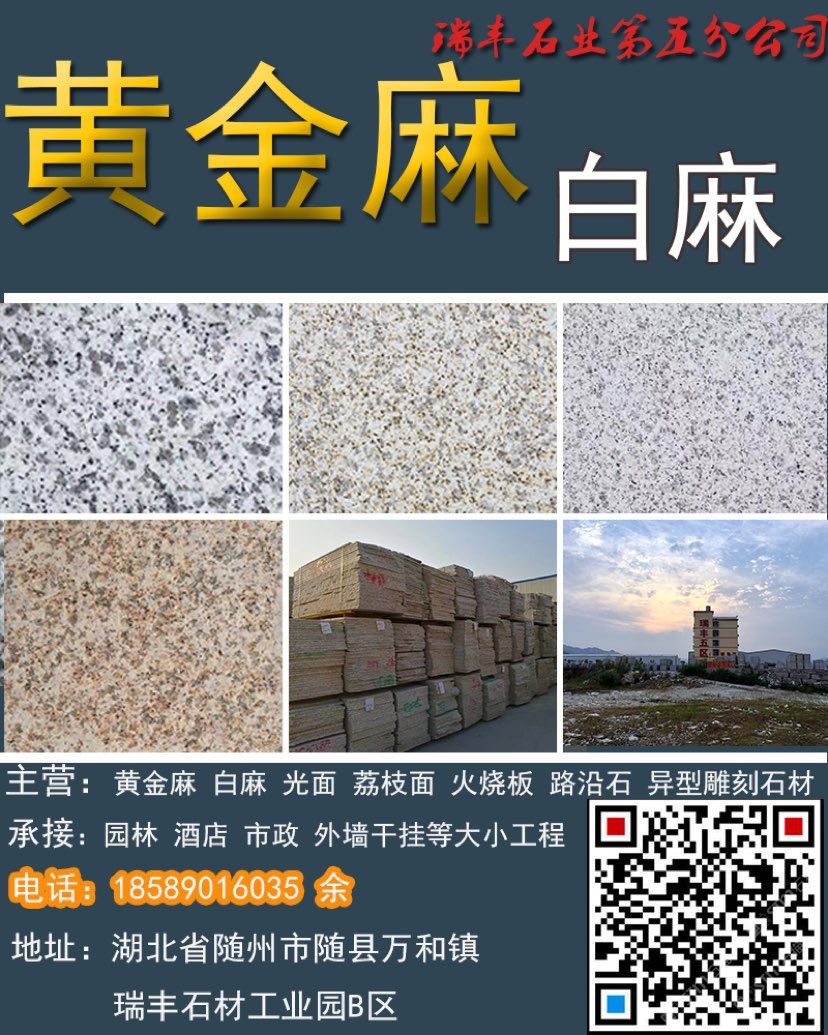 礦廠直銷;黃金麻,白麻,路沿石,蘑菇石,火燒面,光面,荔枝面,機切面,自然面,異形加工等各種規(guī)格板材。承接園林,廣場外墻干掛等各種工程應用板材。規(guī)格齊全,保質(zhì)保量,歡迎新老客戶來電下單。18589016035