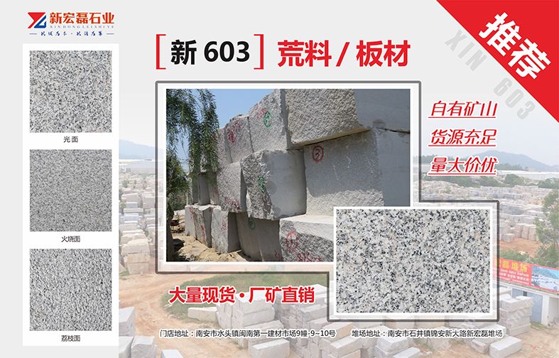 新宏磊石業(yè)有限公司自有礦山,荒料堆場(chǎng)50余畝,有花崗巖和大理石加工廠,是集礦山開采、板材生產(chǎn)加工、銷售出口為一體的綜合性石材供應(yīng)商,在石材行業(yè)已經(jīng)擁有10年以上的生產(chǎn)與銷售經(jīng)驗(yàn)。
