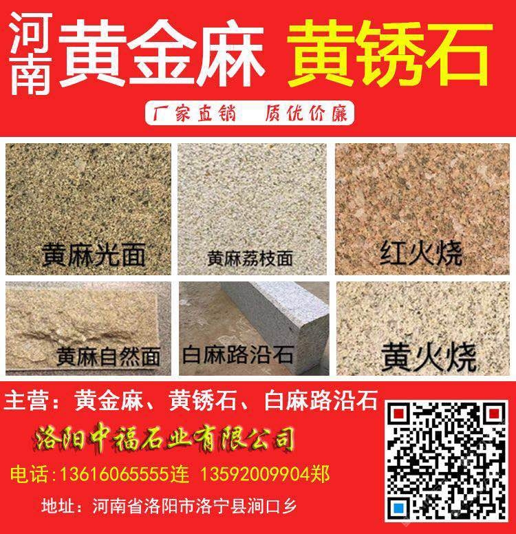 洛陽中福石業(yè)(電話:13616065555連17036286666連13592009904鄭)是河南黃金麻、河南黃銹石、河南白麻、河南芝麻白、角美銹、龍海銹、漳浦銹、g682石材、g682花崗巖、黃金麻花崗巖、黃金麻石材、黃色石材、黃色花崗巖、荒料、路沿石、墓碑石、工程面板、異型加工、芝麻黑廠家、花崗巖石材、幕墻石材、干掛板、馬路牙子、水溝蓋板、花圍樹圍、荔枝面、火燒面、磨光面花崗巖板材等產品專業(yè)生產加工的工廠,擁有完整、科學的質量管理體系。洛陽中福石業(yè)有限公司的誠信、實力和產品質量獲得業(yè)界的認可。歡迎各界朋友蒞臨參觀、指導和業(yè)務洽談。河南黃麻光面河南黃麻荔枝面河南紅火燒河南黃麻自然面河南白麻路沿石/道牙石/路緣石/路側石/鋪路石/路邊石河南黃火燒面河南黃金麻河南黃銹石/河南黃金鉆石材/河南芝麻白/河南白色花崗巖/河南白色石材/河南黃色石材/河南黃色花崗巖