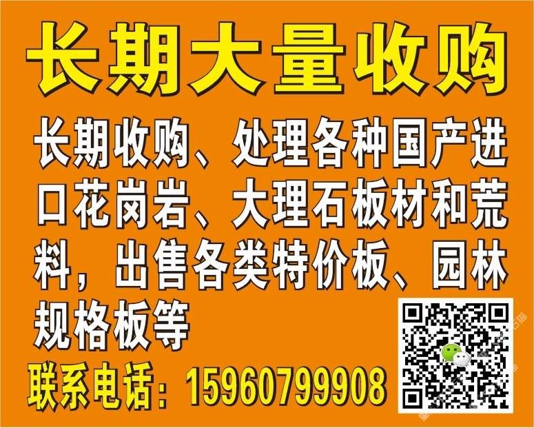 長(zhǎng)期收購(gòu)處理各種國(guó)產(chǎn)進(jìn)口花崗巖、大理石板材和荒料,出售各類特價(jià)大理石和花崗巖、園林規(guī)格板、地鋪等,聯(lián)系:15960799908