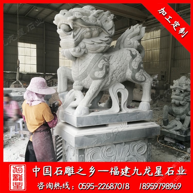 發(fā)布信息: 麒麟神獸石雕廠家——九龍星石業(yè)18959798969 一對石雕麒麟雕像圖片我們經(jīng)常在網(wǎng)絡(luò)上看到。石雕麒麟雕像的表現(xiàn)形式有多,麒麟石雕從形式上有分為:圓雕、浮雕、透雕、線雕等等。 每一對石雕麒麟雕像的造型特征各有不同,石雕麒麟雕像的規(guī)格大小隨著用途也有很多尺寸規(guī)格。 石雕麒麟雕像自古來有風(fēng)shui寓意,擺放一對石雕麒麟在大門口有著很好的寓意。因此,很多人會購買石雕麒麟擺放在門口,這也就有了我們現(xiàn)在經(jīng)常在酒店門口、工廠門口、公司門口、銀行門口等地方看到一對石雕麒麟雕像。大門口通常擺放的是一對3米高的石雕麒麟雕像,或者2.5米的石雕麒麟。