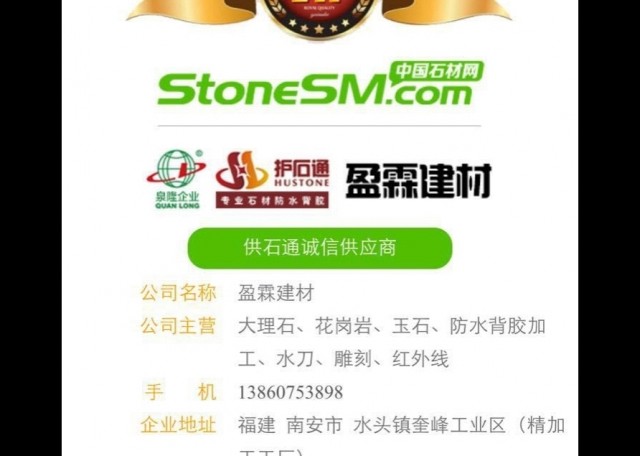 盈霖建材 聯(lián)系人:王培源    138****3898 查看 0595-****0080 查看 主營范圍: 石材輔料及特殊工藝、水刀拼花、石材工藝品、大理石加工、異型加工、 企業(yè)地址:福建南安水頭鎮(zhèn)奎峰工業(yè)區(qū)源福順商廈4樓