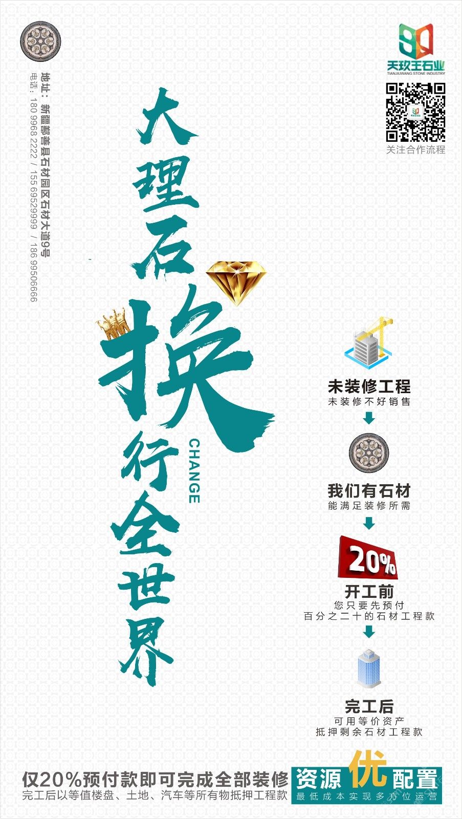 發(fā)布信息: 大理石等值置換資源,抵押工程款! 樓盤、土地、汽車? 只要你想得到的等值資源,就能置換抵押工程款! 工程款未到? 沒關系,大理石等值置換就能開工! 換醒你沉睡的工程! 資金周轉不開? Don't worry, 大理石等值抵押就能盤活你的資本運營! 資金緊張,尋求靠譜供應商? 讓我來!靠不靠譜你說了算! 只需支付20%預付款,就能進行全部裝修!