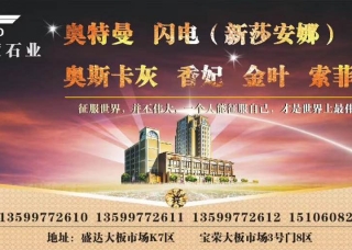 昆明東部石材城中閩石材主營產(chǎn)品:紅棕,英國棕(老礦),英國棕,銀珠,綠星,印度紅,皇室啡5,金世紀(jì),加州金麻,幻彩紅5,白玉蘭(新礦),瑪雅灰2,拿鐵灰,白玉蘭,白玉蘭(宇宙米黃),塞浦路斯灰(比薩灰),瑪雅灰,瑪雅灰1,意大利灰(塞浦路斯灰),奧斯卡灰企業(yè)地址:福建南安水頭順華大板市場第二裝車通道